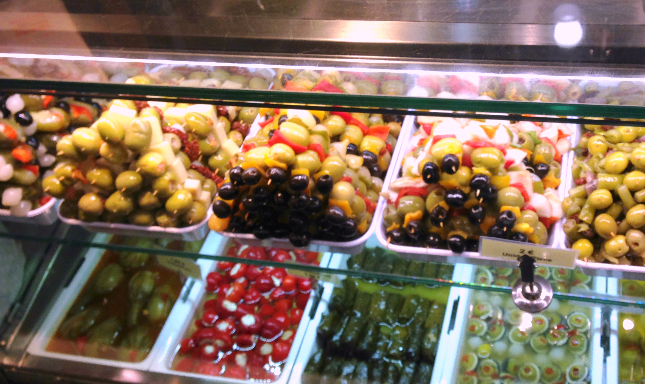 Once you’ve fought your way to the counter, you can get a plate filled with whatever you want them to throw in there for 3-4 Euros. The first time I went I got a gigantic plate load with 20-30 olives, and would happily have eaten more. On my next visit, I filled up on so many stuffed olives I ended up skipping lunch altogether and going straight for dessert. I still can’t decide which I liked best.