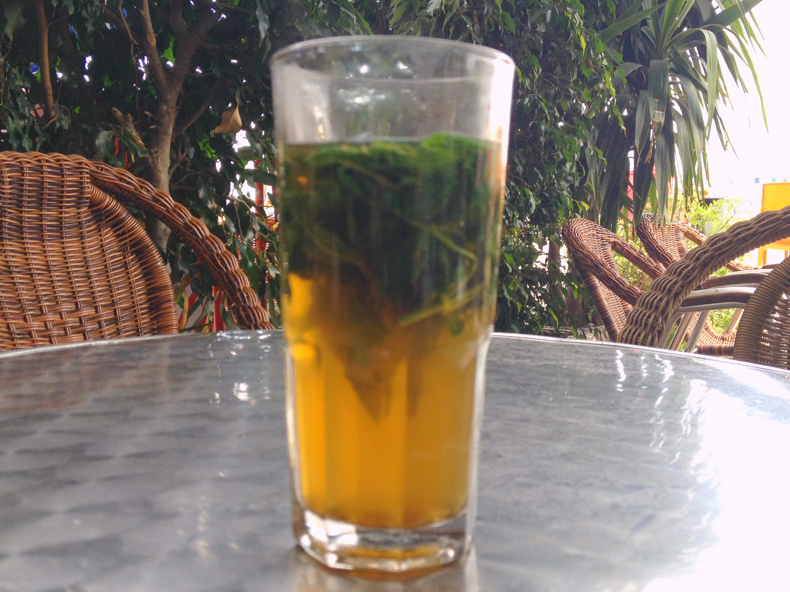 Fresh mint leaves steeped in hot water with lots of honey. These mint leaves are so fragrant they actually trump the taste of the honey, which is so prevalent you have to fight to keep the flies and bees out of your glass.