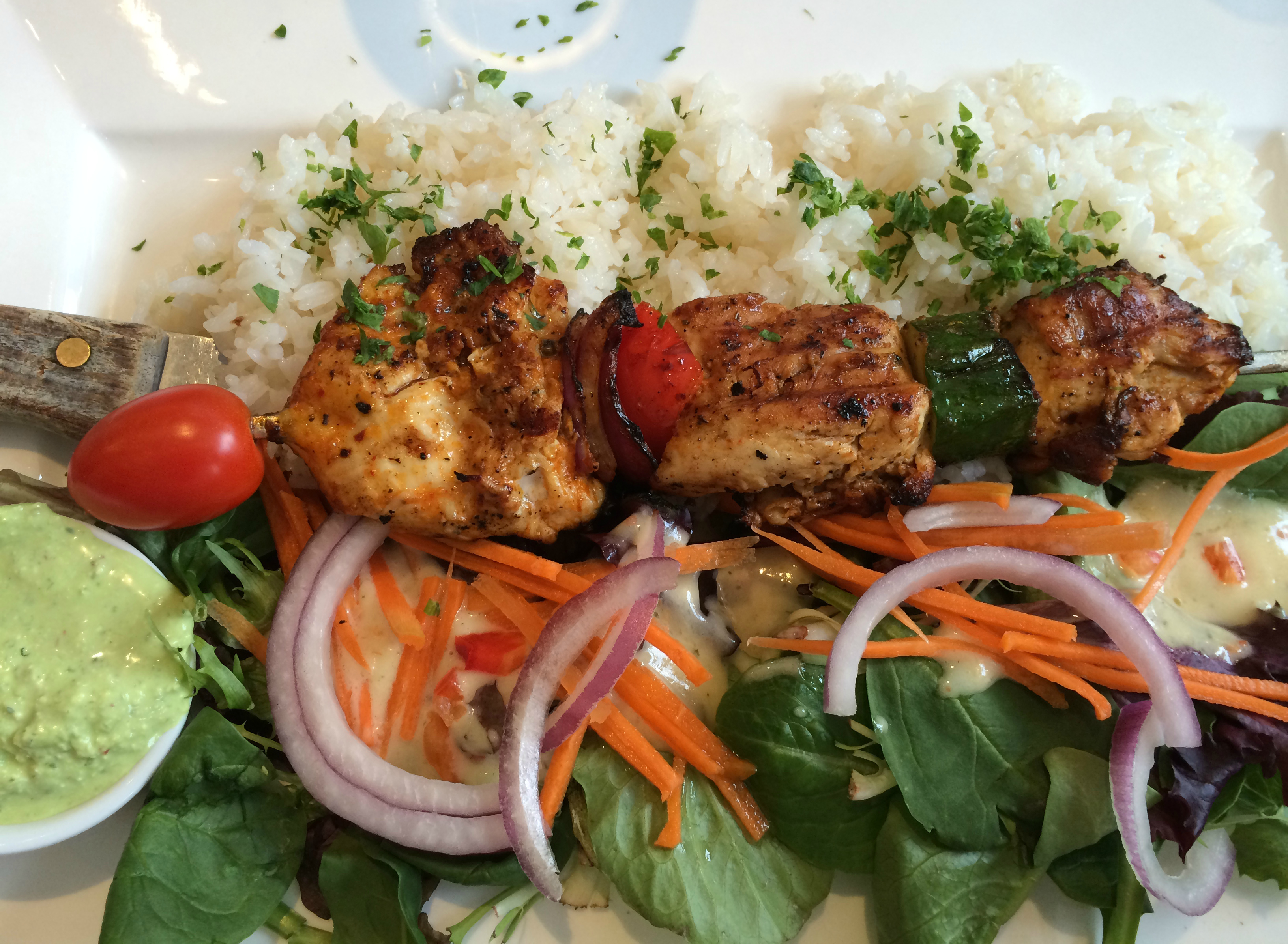 Tender pieces of chicken marinated in wine and herbs, grilled on a brochette, and served with a delicious green garlic goat cheese dipping sauce with sticky rice and a side salad.