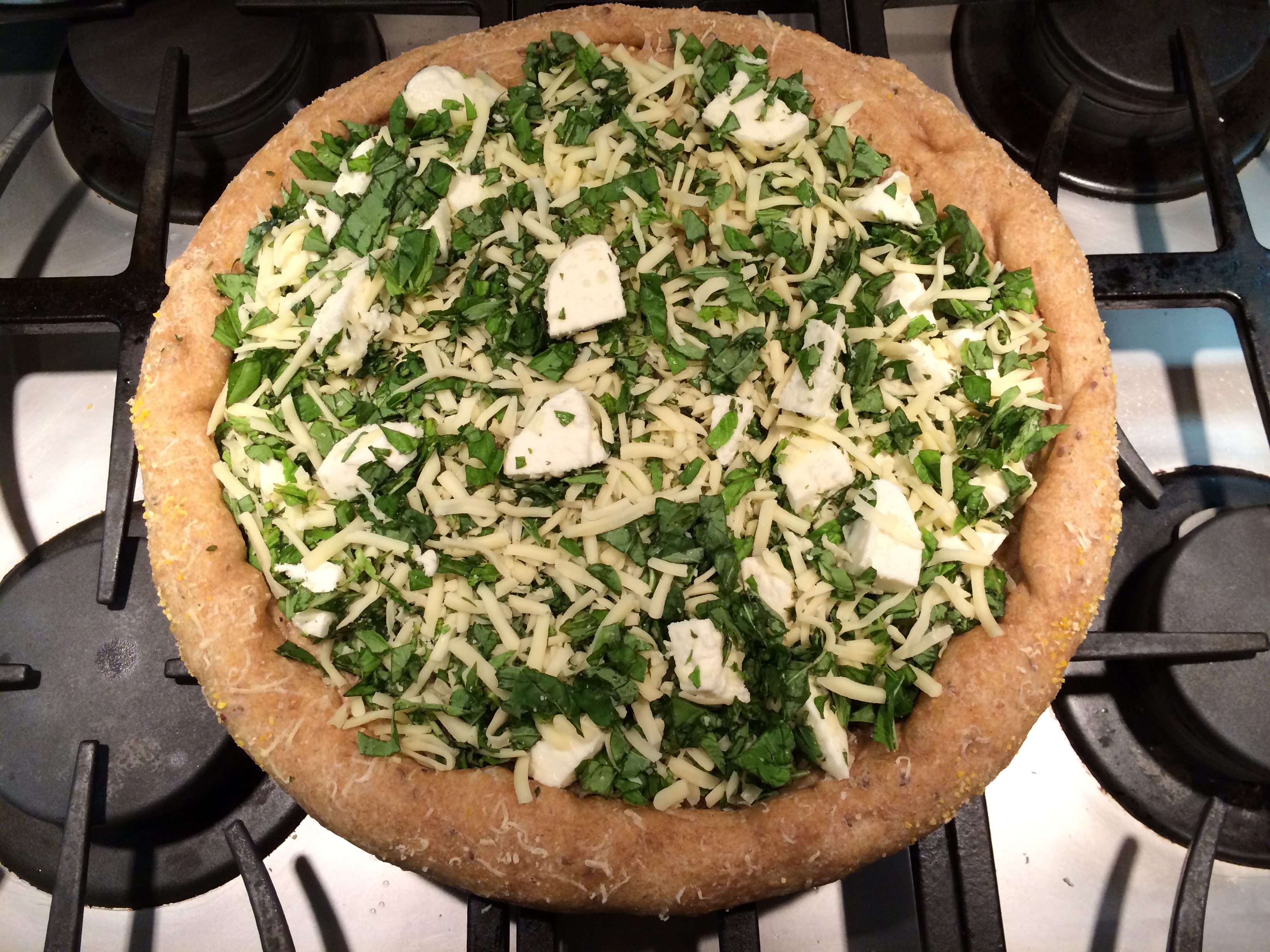 1. Preheat the oven to 425°F. Sprinkle the pizza stone with corn meal and stretch the multigrain dough over it, folding the edges to make a rough border.
