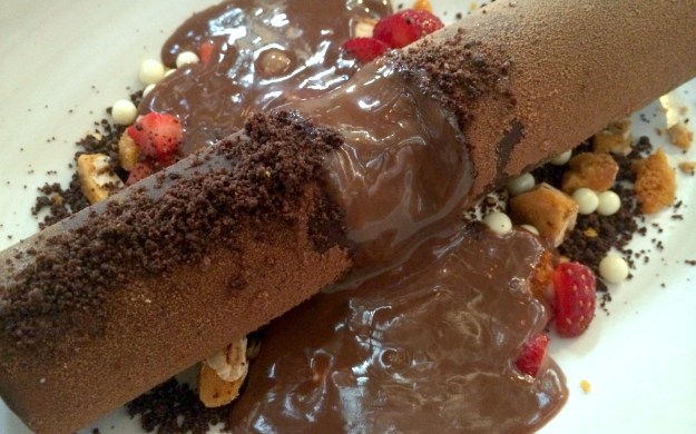 Thick hot chocolate poured over a moist chocolate devil’s food cake log that has been dusted with cocoa and stuffed with dark chocolate pate, smooth white cream, crispy hazelnut brittle, and crunchy white chocolate pellets–then topped with chocolate cookie crumbs and strawberries (phew)!