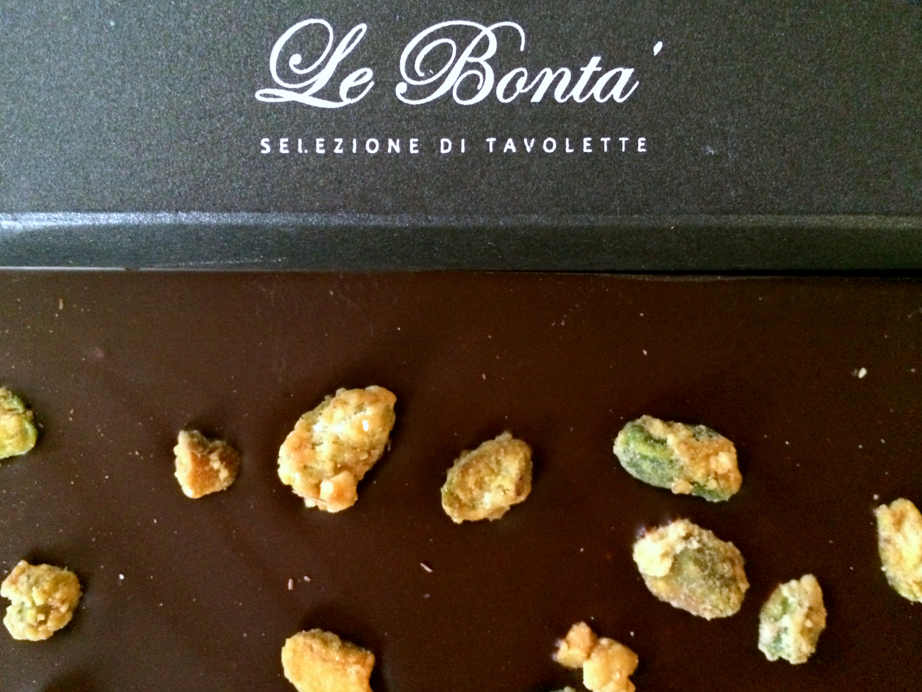 Le Bonta chocolates are made in Lucca, which happens to be my favourite town in Italy. I knew there was no way a bar that looked like this gorgeous chocolate pistachio bar wasn’t going to be delicious, but after tasting a few of the other chocolate bars that the store had laid out for customers to sample and finding them to be a bit waxy I wondered if I would be disappointed. But I wasn’t.