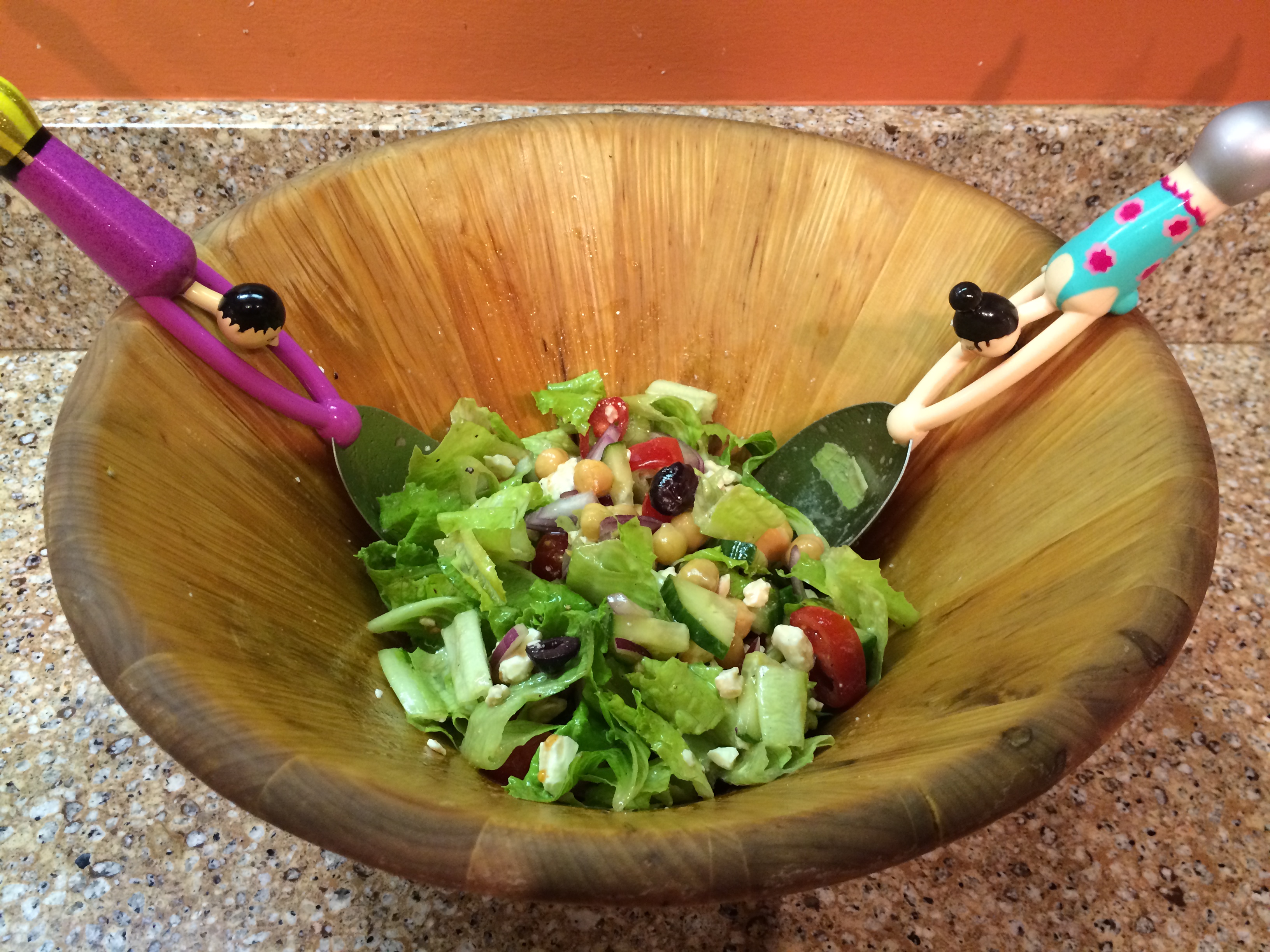 This meal hits every note for me: the vegetables are crisp and tasty, the olives, onions and feta cheese give it the zip of a Greek salad, the vinaigrette is tangy and citrusy, and the tasty little garbanzo beans transform it into a filling meal.