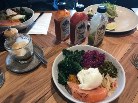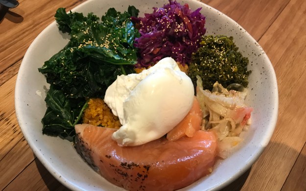 Fisherman’s Grits Bowl: bulgur grits with kale, confit salmon, fermented greens, grapefruit fennel, cracked amaranth, curtido, sesame, and a poached egg.