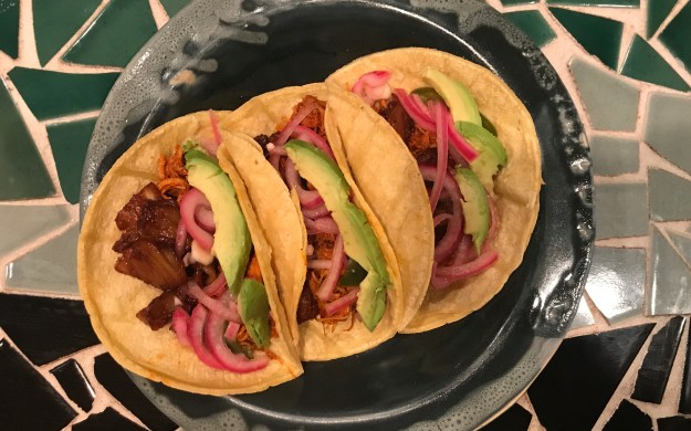 Chicken thighs cooked in orange, lime, and achiote paste and served in warm corn tortillas topped with sautéed pineapple, pickled onion, and avocado slices.